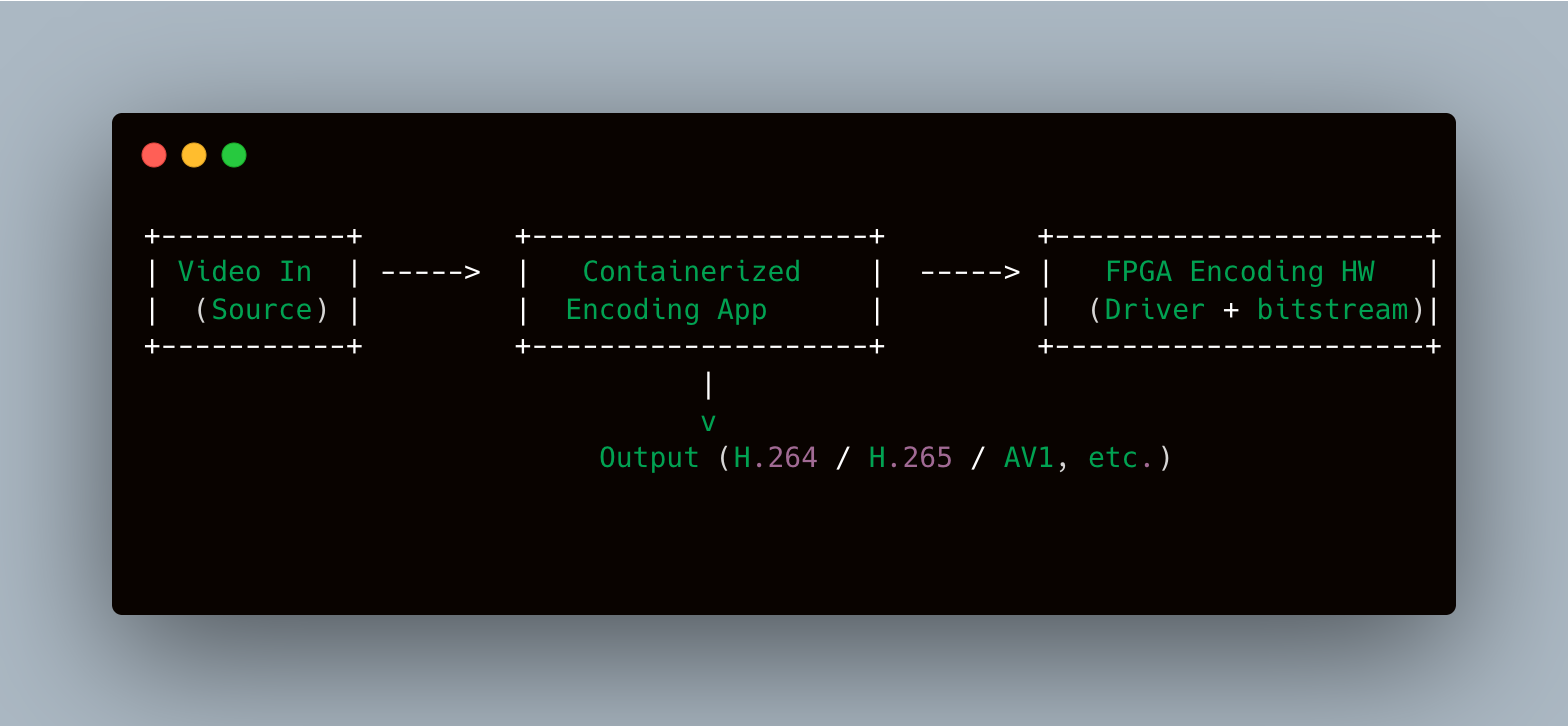 Containerized Encoding App: A Docker container that runs a specialized encoding service, linking to the FPGA driver libraries.